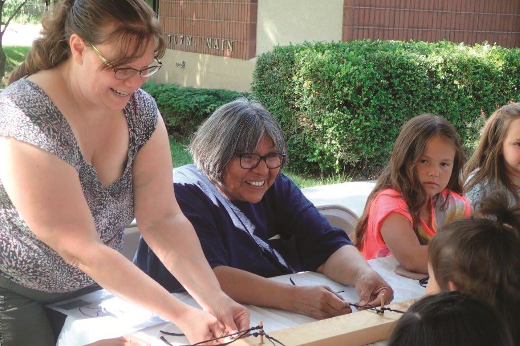 Anya Kitterman, Hill Air Force Base Cultural Resource Manager, left, and Patty Timbimboo-Madsen, Northwestern Band of the Shoshone Cultural and Natural Resource Manager, teach tribal children how to make cordage bracelets during an event at Hill AFB, June 21. Such an event provides an opportunity for Hill AFB to partner with a local consulting tribe in bringing a piece of their history and artifacts to them, which are generally inaccessible. In turn, tribal elders share tribal knowledge, which helps Hill AFB gain a better understanding of their concerns and resources.